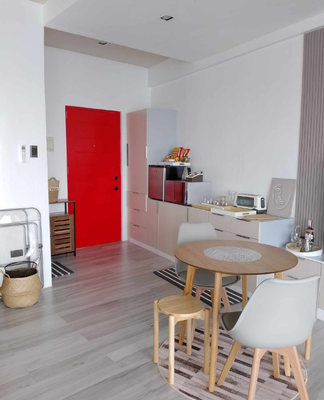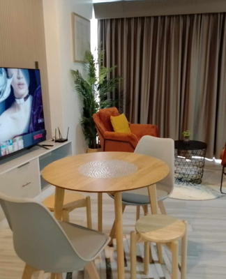 Enjoy the convenience of home with a sleek dining set and a fully equipped kitchenette for intimate meals.