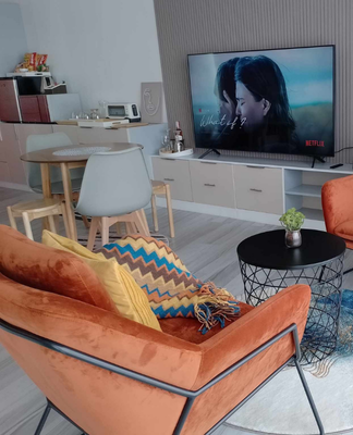 Unwind in a stylishly curated lounge featuring vibrant accents and a large Smart TV for your favorite shows.